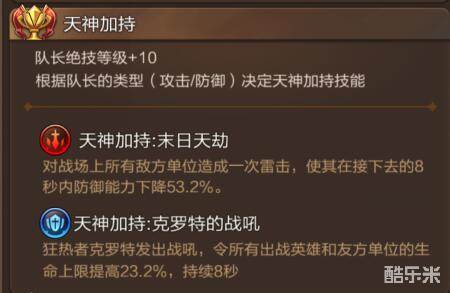 天神之力加持分为攻击型和防御型,按照职业划分战士、刺客、游侠、黑魔导这些属于攻击型,火神的加持技能就是末日天劫,反之就是防御型克罗特的战吼。