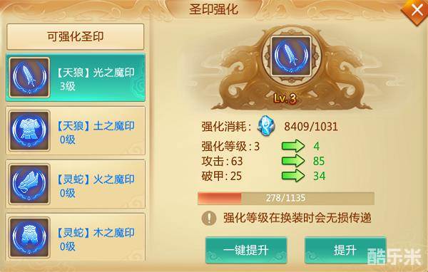 更换圣印将自动转移强化等级以及熟练度,强化过的圣印不能直接脱下只能替换,