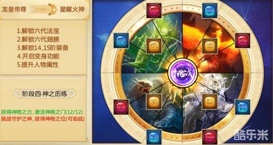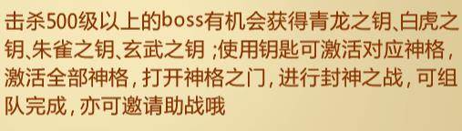4. 神之历练:使用四种钥匙(击杀500级以上BOSS掉落/商店购买/使用元宝代替)或者经验(巅峰230级以上经验)激活对应的神格,全部激活后点击“挑战”开启封神副本挑战,胜利并且等级在巅峰250以上即可完成转职