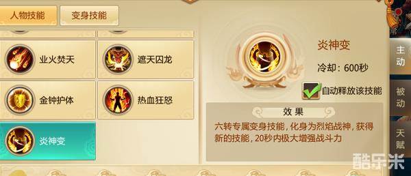六转后增加人物主动技能“炎神变”,使用后化身烈焰战神,改变外观,人物所有主动技能替换为强大的变身技能,在变身持续时间无法使用人物技能,只能使用变身技能,变身技能初始为3个,剩余的3个天赋需要在神通天赋点亮后才可使用。