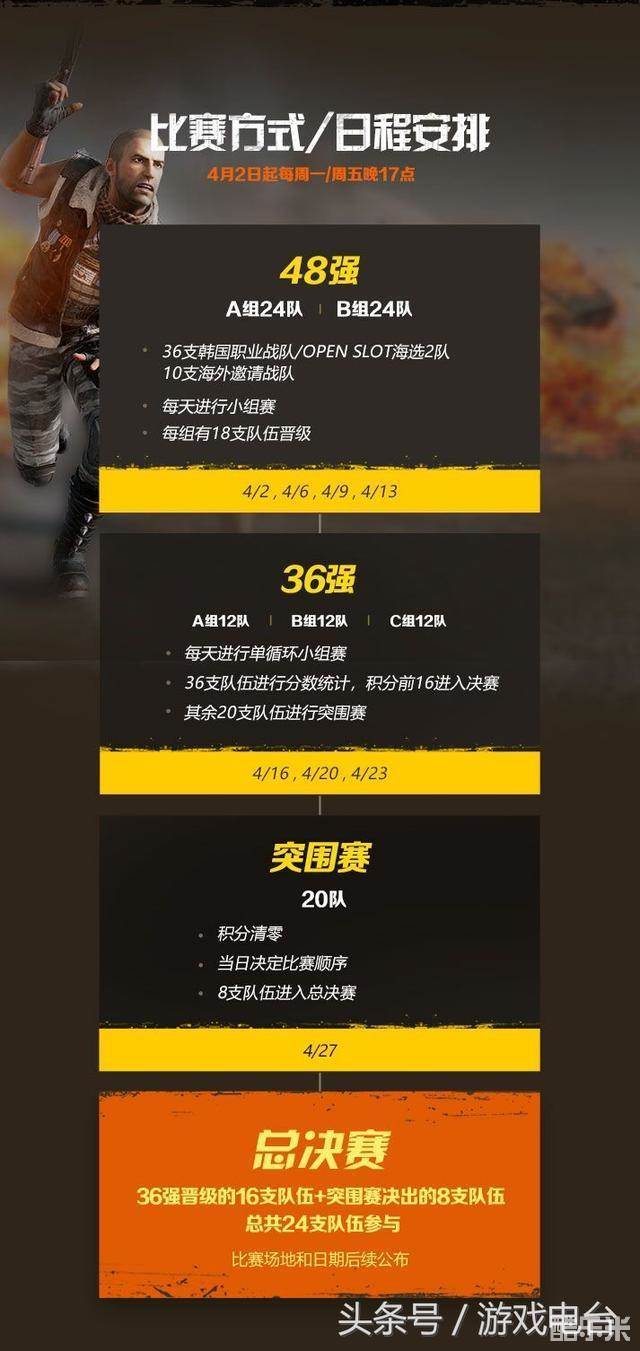 比赛从4月2日开始,每周一、周五晚17:00开始,前4个比赛日由A、B两组分组决斗,36强经过二次角逐进入突围赛,之后进行最精彩的总决赛阶段。