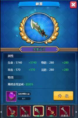 这个是灾变之刃,登录就可以送的一把神器。属性与刚才的那把末日决战一样,但是多了一个特效:离线金币增加10%。这个就比较屌了。
