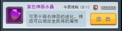 紫色神器水晶是用于神器的进化的,可以在商店通过竞技点购买。需要1W竞技点,还是有点贵的。需要肝个几天才可以。