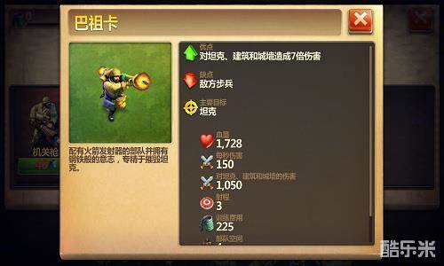 巴祖卡的出现,使坦克不再是战场中不可撼动的地位,游戏中的战争格局也发生了重大的改变。除了运输机、轰炸机等飞行兵种,巴祖卡也在进攻军队中占有一席之地。依据高倍伤害的火力,这支巴祖卡军队可以厮杀坦克大军,快速摧毁建筑和城墙,我们将看到他们横行于整个战场的身姿。