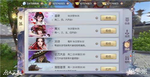 泡泡温泉,喝喝茶,同样是《烈火如歌》手游的帮派中一项有趣的玩法。每周二、四、六,温泉活动将定时开启,玩家们届时便可相邀前往帮派驻地泡温泉,享受放松身心的愉悦时光,顺便获得丰厚的活动奖励。
