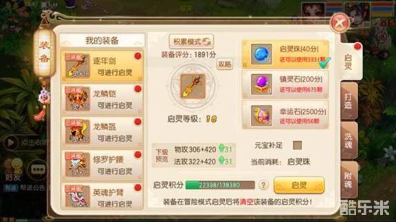 积累模式,就是在积分达到一定数值后,自动启灵成功,积分数值随着装备启灵等级的提升而提升,而且在成功的同时,赠送一部分的积分。