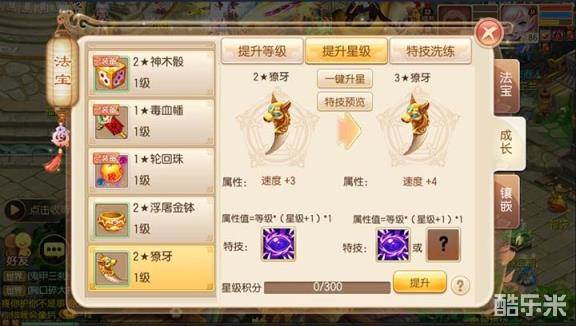 打开法宝界面,点击“成长”,再点击“提升星级”,在提升星级界面,原有的“特技预览”按钮上方可以找到“一键升星”功能。