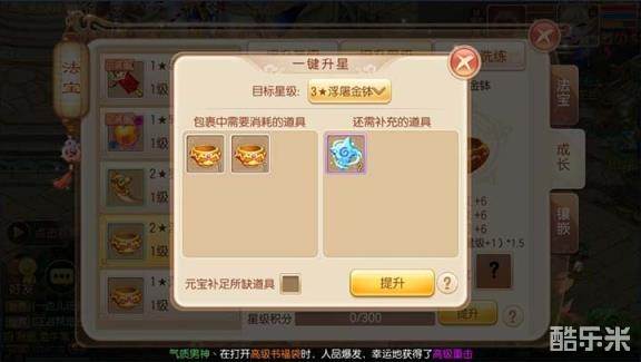 4、如果包裹中升星道具不够,也可以选择直接用元宝补足所缺道具,直接点击“提升”按钮。