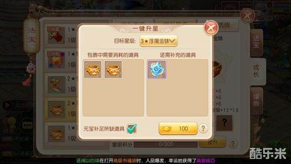 2、一键升星优先消耗成品法宝,不足的部分再用法宝碎片补足。