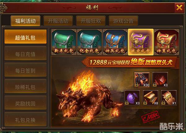 战宠系统开启后,首充会免费送一个战宠倾城,是唯一一个女性战宠。有能力者可以在福利里面买一个战宠礼包——双头犬,双头犬在前期是非常实用的一个战宠,在平时刷怪还有打僵尸围城、精英炼狱等等都非常给力的,特别是在僵尸围城时候,你只需要不停去捡材料就好,你的双头犬会负责帮助你一直不停的输出,十分给力吧?千万不要小看这个双头犬,这个战宠在前期是所有人都必备的一个战宠,即使是不充值的哥们,依靠前期的回收元宝,也必须要买。