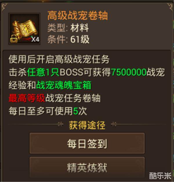 现在来说说战宠的培养,每个战宠可以通过升级及转生提高属性,每转生一次,都能对自身角色带来高额战力。战宠经验可以通过战宠副本或商城直接购买获得战宠丹,也可以通过击杀精英怪获得战宠卷轴,每个角色每天可以完成5次高级战宠任务、15次中级战宠任务和50次低级战宠任务,每天坚持完成任务,战宠升级不用愁。