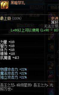 海博伦耳环的属性可以说简单明了,22%三攻加上接近110的四维。单纯以属性对比混沌、三生、英雄王而言,黑暗祭礼只能说相差无几,甚至于如果不算递减效应的话,海博伦可能还要略弱于英雄王一筹。