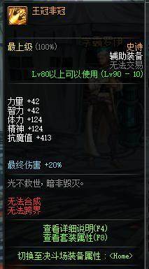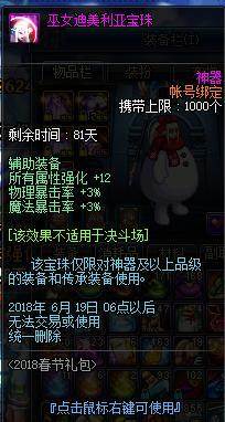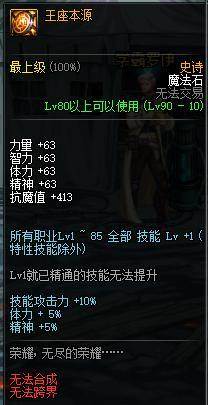 1-85级全技能+1、10%技能攻击力、5%体精,这件装备的提升可以说照顾到了绝大部分职业。无论你是奶爸、奶妈还是异常流、百分比,你都可以轻松的get到自己的点。