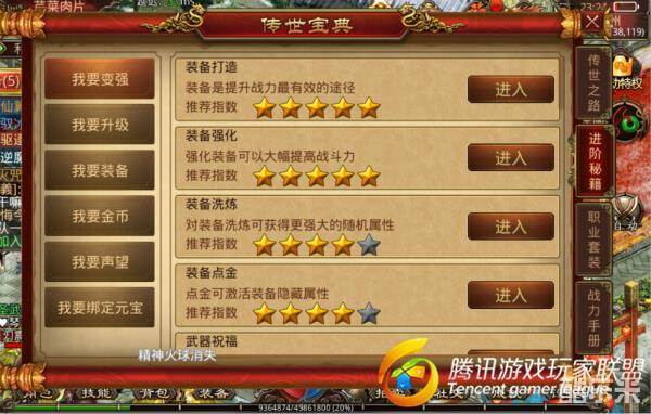 玩家想要变强,可以查看各种方法以及自己达到的星星数量,星星数量越多,玩家完成地越好,无论是想要装备、金币、声望、绑定元宝都可以在传世宝典进阶秘籍中查阅到。