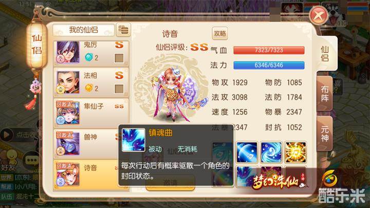 2)“镇魂曲”是一个不错的辅助技,攻击后有概率驱散一名队友的封印效果确实给力,正因为有了它才使得诗音成为了封印阵容的克星;