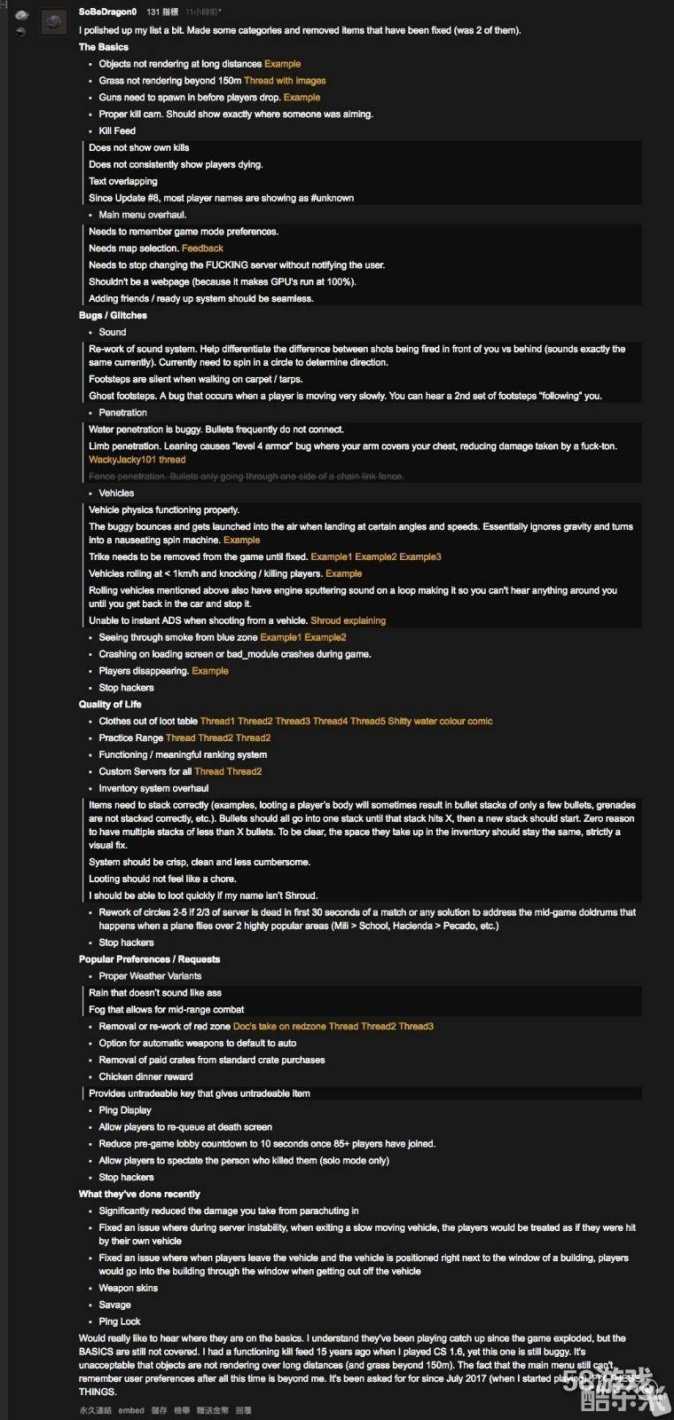 近日,PUBG推出了新的箱子、武器皮肤以及第三张地图“蛮荒”,然而对游戏内容优化速度过慢引起了国外网友的不满,一位名叫“SoBeDragon0”的网友列举了目前自己发现的PUBG中存在的诸多问题。