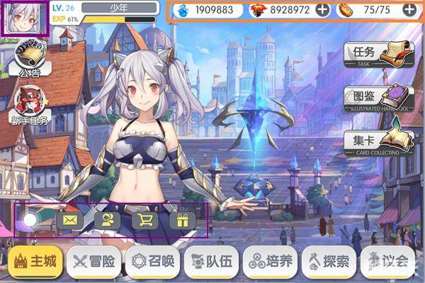 主城右上角为资源栏,从左至右依次为魔能、圣神水和体力。魔能为伙伴培养、魔卡同步、圣物增强等需消耗的资源,通过关卡、副本、委托等所有战斗胜利都会获取;圣神水可以购买各种道具、元素、召唤强大的伙伴,是游戏的硬通货,通过完成任务、每日签到、成就奖励与氪金都会得到!体力则是在游戏中进行战斗所必须的。