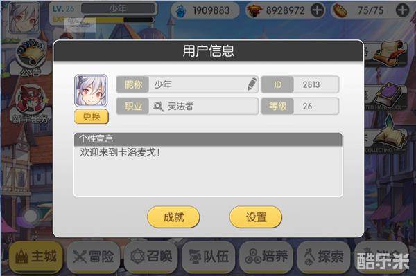 左上角的头像会与陪伴的伙伴保持一致。点开头像后是冒险者的信息,在这里可以查看账号ID、职业、等级;更换头像框;修改个性宣言等等。还是查看成就与修改设置的便捷入口