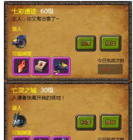 这里是坐骑副本的界面,可以看见两个副本一个30级开放一个60级开放。分别是亡灵之城和七彩遗迹。所产出的坐骑也分别是亡灵战马和七彩神鸦。