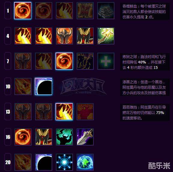 吞噬鲜血(Q天赋)、炼狱之球(Q天赋)以及漆黑之池(R2)是这套打法的核心天赋,可以叠加伤害、提高弹道速度来保证命中率。罪恶难挡是阿兹莫丹团战单体输出的关键。其他层天赋则是根据阵容情况来选择。