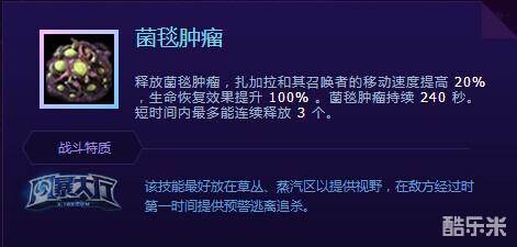 结构重组:以前我觉得这个天赋很垃圾,可是测试过之后觉得还不错。10级时英雄回血是3.88,在菌毯上每秒回5,如果加了这个天赋就是秒回19,是正常英雄的5倍。而扎加拉基本上是一直在菌毯上行走,所以这个天赋给了她很强的恢复能力使她能更好的赖线。