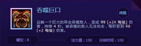吞噬巨口:团战流点这个,前面已经分析过了主要作用在于吞掉几个然后集火剩下的对手,最好吞对面后排秒前排,因为吞对面前排的话队友很大可能也被卡住导致对方后排有输出空间,具体情况还是看对方站位