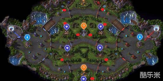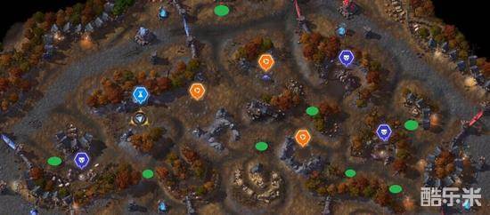 上面绿色椭圆是放坑道虫的放置地点,只截了一半地图另一半自行对称。基本上坑道虫是放在靠近地方门或者堡垒的草里或者转角处。坑道虫的强大支援能力在这张图上体现的淋漓尽致,经常可以刚抢完祭品迅速去另一边推线,令敌人顾此失彼。因此这张图是LZ扎加拉胜率最高的一张