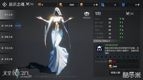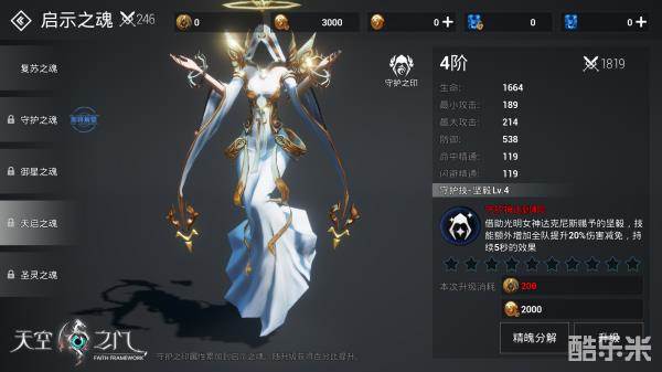 而启示之魂的技能方面,冰霜女神的技能借助的是其睿智;火焰女神则借助的是其狂怒;光明女神是坚毅,虽然调动的女神不同,但技能的效果却是一致的,1阶的攻击提升、2阶防御力提升……总之,启示之魂的技能就是超大的大招,能让战斗瞬间发生变化。