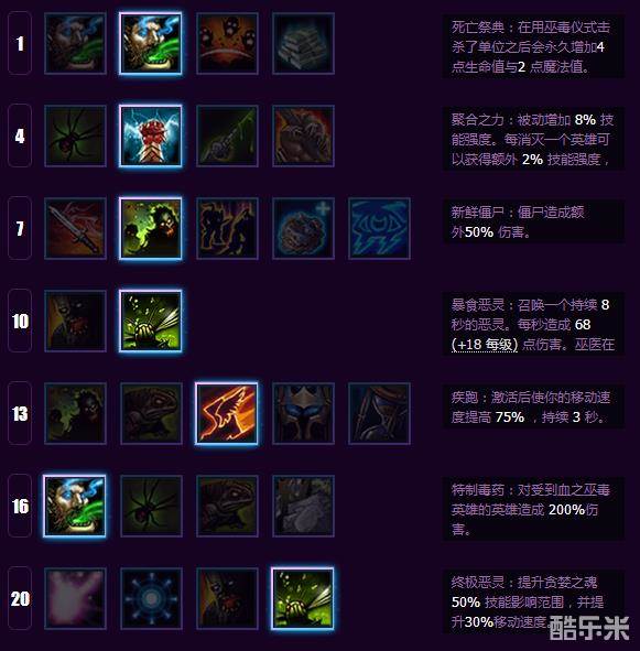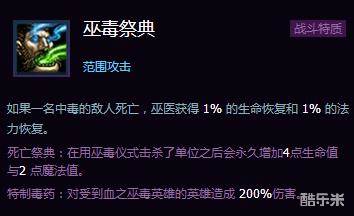 1)死亡祭典(特质)注意,特质其实属于天生被动技能,但有时候一些职业是主动激活或者通过天赋加强为主动技能:死于死亡祭典的单位,你会永久增加4点生命和2点法力,单位包括,小兵,野怪,英雄。最后20级时,你会拥有3K以上的血量。玩过WOW都知道,PVP的法师血量是多么的重要。提示:你的普攻和技能都有这个被动技能特效,而且不用非要补刀最后一下,只要那个单位身上带有毒,被任何方式打死,都算在内。因此合理的运用技能和普攻来叠加你的成长。备选:鲜血仪式(特质),这个被动我建议带线清野拆塔流使用,或者已放保护奶量很足,需要你频繁的参与团战输出清线,但是我很少用这个特质。