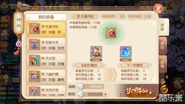 新出的神兵系统对于大伙来说则是一个无消耗提升实力的好去处,只要我们每周完成轮回虚空以及英雄副本就可获得神兵材料。虽然这些材料会稳定获得,但也存在获取数量有限的问题,因此本着收益最大化的原则个人推荐优先将武器突破至3阶,这样不仅通过提升等级能够获得90点的攻击加成,还可以通过镶嵌2枚灵石还能获得100多点的攻击加成,自然加成总量还是相当可观的。