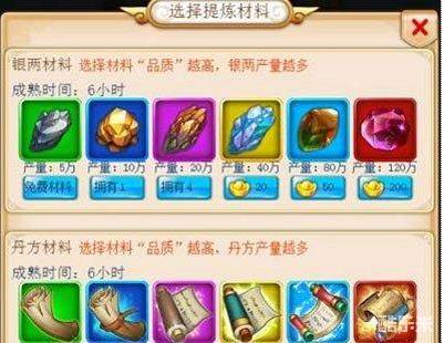 找寻到【我的炼金炉】这个按钮,选择进入,在炼金炉中可以实现两大类型材料的炼制,银两以及丹方。每种材料里都设置了六种品质,绿蓝紫黄浅蓝红等,不同颜色代表不同品质,对应不同的武将。材料品质越高,炼金炉产量越高,红色能有120万的银两,而绿色只有5万,差距不是一般般大。
