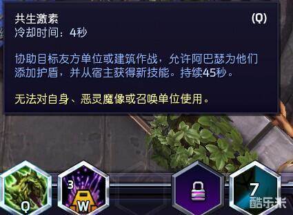 协助目标友方单位或建筑作战,允许阿巴瑟为他们添加护盾,并从宿主获得新技能。持续45秒,可手动取消。