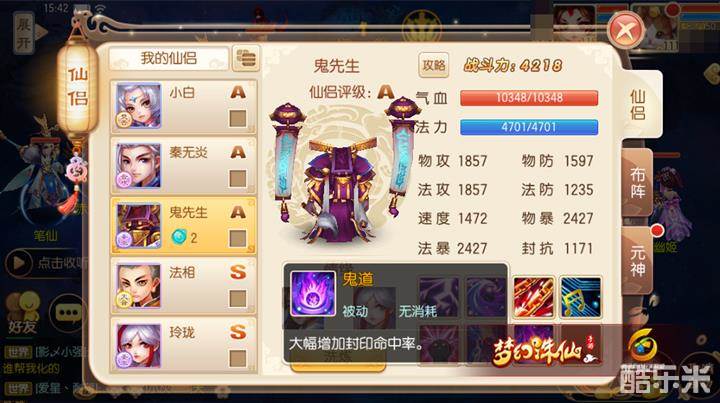 在我们可拥有的三个圣巫仙侣中,能够最早获得且最容易获得的就是鬼先生(只需消费100元宝即可),所以在游戏初期我们就可以搭配出单封阵容来压制对手,以便在竞技性的活动中获得更佳理想的成绩。