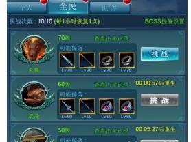 重头戏的【全民BOSS】,这里BOSS的实力有了明显的提升,对于玩家来说难度也是不小的,重要的是这里的BOSS是可以和其他玩家一同讨伐的,伤害高的玩家可以得到最多的奖励。