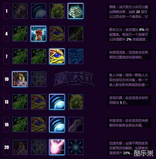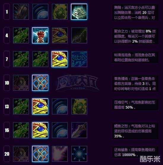 这是一套我个人玩小鱼人非常喜欢的加点方式,同时我也是多盘实战出来有效的加点,10级后体现于非常强的先手控制,团战中混乱中丢出W技能可以打出非常高的AOE伤害,20级后更是可以轻松秒脆皮英雄(W后立刻R过去“啪啪啪”),而章鱼大招只有50秒CD,使得小鱼人的真空期不会太长,上一次团战打完又可以立刻投入到下一次团战中去。可能有些人喜欢在4级点毒伤,但聚合之力只要小鱼人跟蛋不是同时阵亡,轻松可以叠到6层并且不怕因为小鱼人被击杀而消失层数,为小鱼人技能爆发提供了大大的提升。