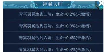 神翼的培养在达到一定的品阶时,还可以激活额外的属性效果,越是高品质的神翼,其【神翼大师】带来的属性提升也就越好。
