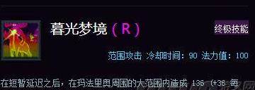 暮光梦境(R2):伤害高,沉默强,对面突前的刺客和辅助妥妥地就被残了。引导过程中不可移动,如果被打断则CD五秒,施法范围大概是你自己为圆心,六个小兵为半径的圆。