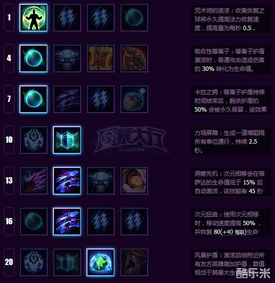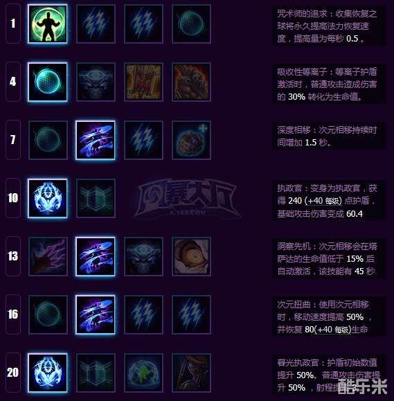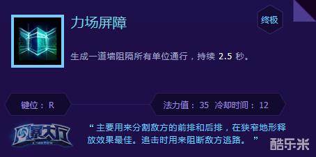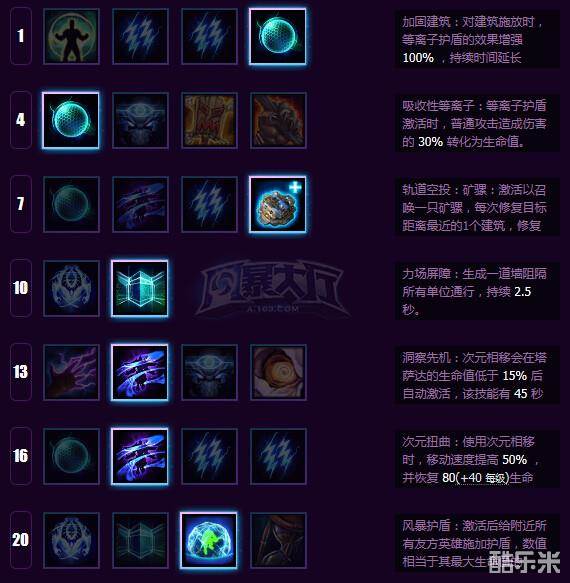 强化护盾加强保人的能力,以及力场大招控场的纯辅助加点,13和16点出双E用于保命。