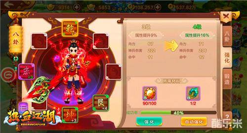 已经生成的卦位可进行再次强化,或者分解替换。这就使得八卦玩法成为江湖中最“环保”的系统玩法,每次分解产生的八卦能量都可以循环再利用强化八卦,进一步提升八卦的基础属性,助力玩家提升。八卦玩法的八大方位就如同玩家角色页的各部位装备,八卦收集到一定组合,还会产生独特的套装属性,自此威震四海不再是梦。