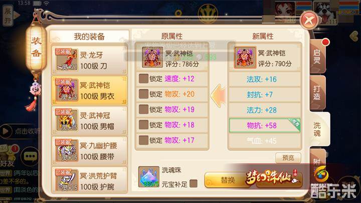 这件衣服的亮点则在于魂属性的洗练上:没有选择系统的推荐魂,而是选择了攻速魂,不得不说带来的27点速度加成以及61点攻击加成使得物主拥有更好的求组条件,并且五橙外观确实惹眼。