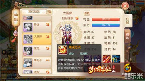 在离魂恐咒这个神级被动的加持下,大巫师的控制能力得到极大程度的延伸,被大巫师封印的敌人只能靠普通攻击输出,削减了敌人整体的伤害,同时大巫师的巫蛊和离魂恐咒都具有损失气血的debuff效果,相当于一个群体持续减伤技能,在大巫师控制住敌人后能提供高额的伤害,配合己方其他仙侣能快速造出敌方的减员,形成以多打少的局面。
