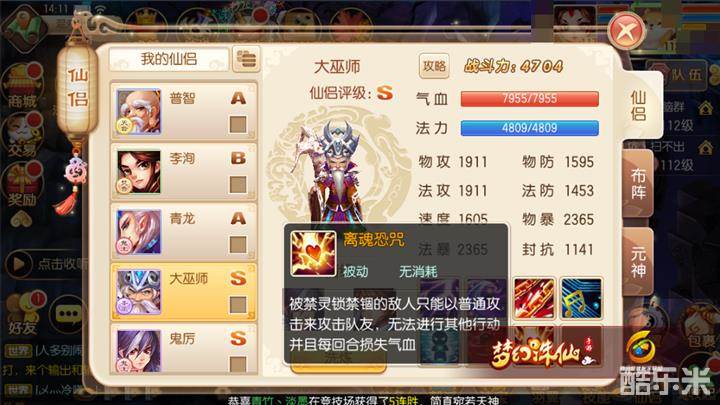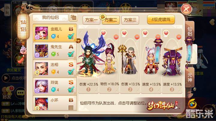 阵容特点:辅助仙侣上阵过多虽会降低阵容的输出量,但却可以大大较少“翻车”几率,尤其是圣巫仙侣可以有效削弱对方阵容的输出能力,轻易改变敌我双方实力差距,以便我们在战斗中掌握主动权。