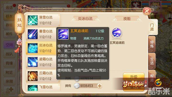 玄冥追魂箭:修罗魂术,灵魂锁定。蓄力1回合,下回合发动不可闪避的强力攻击,目标气血越低伤害越高。连携技能,可触发青云队友施放唤雷剑诀攻击敌方目标。使用限制:当前气血≤气血上限50%,可搭配轮回天书使用,当前气血≤气血上限52%,提升轮回技能提升血量上限。其实说白了,这个技能不就是鬼王的后发吗?在这里个人推介各位少侠轮回天书不实用此技能。