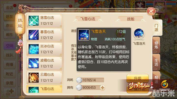 飞雪连天:以身化雪,飞雪连天。苍羽阁终极奥义,随机攻击敌方5次,伤害以递减的方式输出,附带吸血效果,使用后自身虚弱2回合,10回合内无法再次使用此技能。苍羽的大招,个人理解其实就是收割技能,在敌方血量都不是很高的情况下开大直接结束战斗,而且我觉得这个大招好帅阿有木有,让我想起了金庸先生的名著“飞雪连天射白鹿,笑书神侠倚碧鸳。”