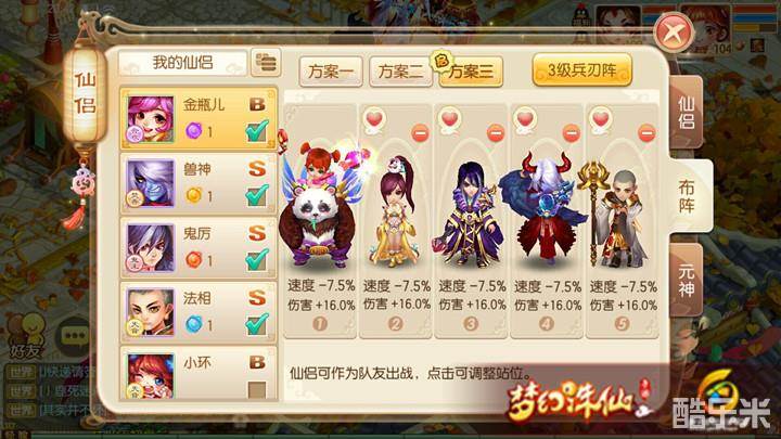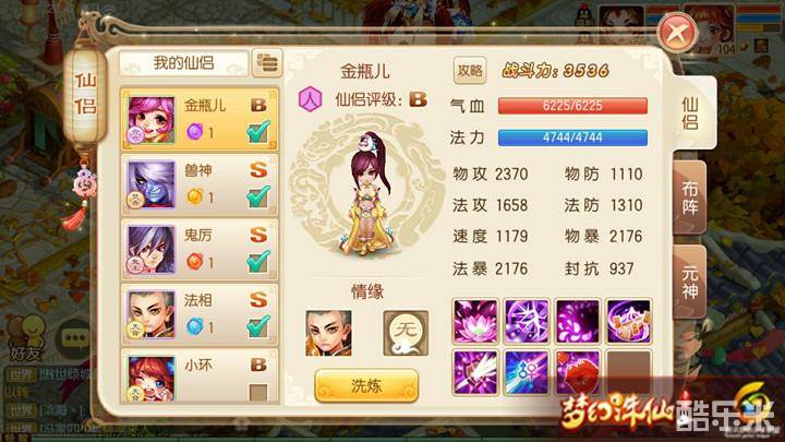 仙侣搭配方面,我这里是选择了法相(出手前,被攻击一次伤害增加11%,可以理解为弱版的“隐忍”)。因为金瓶儿毕竟是个B级仙侣,速度比不了A、S级的仙侣。所以选择这个技能就大大增加了金瓶儿的输出能力,也可搭配鬼厉、秦无言上阵,大幅度的增加了物理攻击力和速度,大家可以自己搭配选择,灵活多变。
