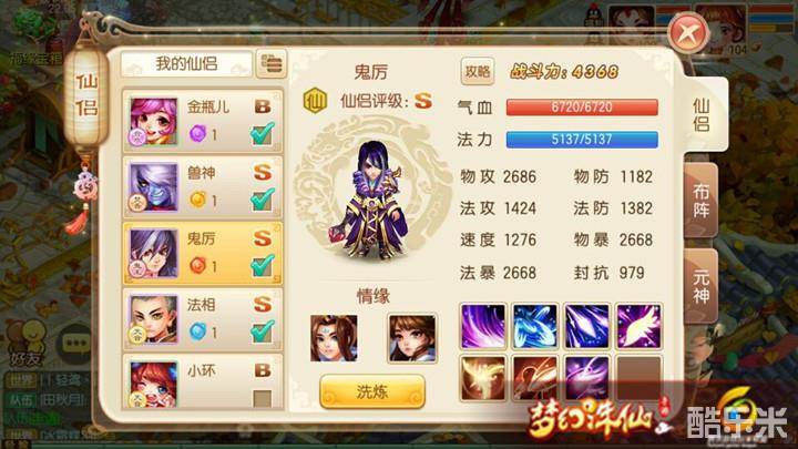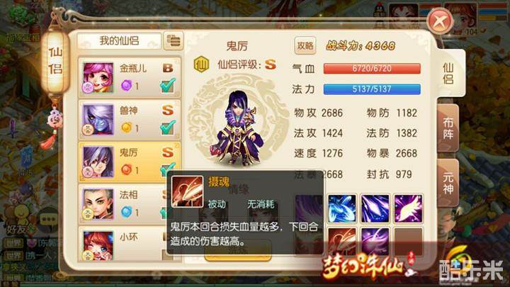 人物35级以后就可开启仙侣系统,鬼厉作为S级的仙侣,只能通过使用50个“魂之蕴”在仙侣界面兑换,而魂之蕴虽然可以从日常中获得,但几率并不高。当然少侠们也可以选择直接在商会中购买魂之蕴进行兑换,毕竟鬼厉的存在还是很有价值的(如果你钱够多的话),单体输出在仙侣中无人可比,下面就来说说鬼厉的技能。