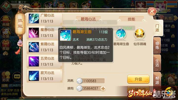 碧海潮生曲:回风拂柳,碧海生潮。法术攻击2个目标,在门派技能30/60级时增加一个目标。灵音殿群体法术攻击,也是每个门派都有的入门心法。此技能为灵音殿PVE日常任务主要输出,开全灵点输出不亚于任何门派。