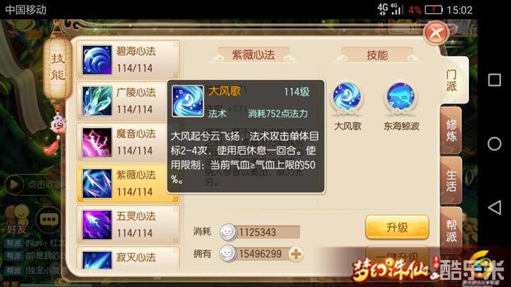 大风歌:大风起兮云飞扬,法术攻击单体目标2-4次,使用后休息一回合。气血要求:当前气血≥气血上限50%。其实这个就是法版鬼王的鬼狂击,不同于鬼王的是该技能极其不稳定,最高可攻击4下,最少2下,在这个看脸的年代,颜值高的人自然而然的就会攻击4下咯。打出俩下的少侠也会被称为会休息的“焚香”,可搭配轮回天书使用,提升轮回点提高下一段大风歌攻击概率。最高为10%。