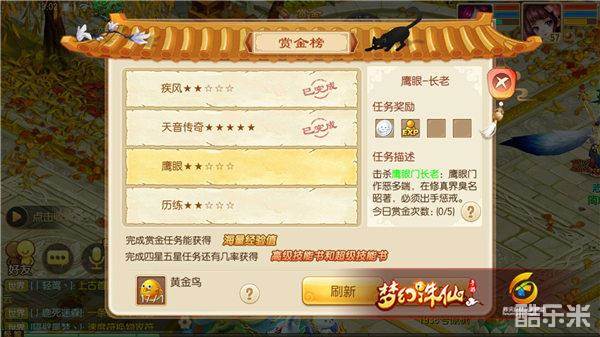作为冲级和赚钱的手段之一,赏金任务在《梦幻诛仙》中很受大家欢迎,到了30级小伙伴们可以每天在京城的赏金榜那里领取任务,每人每天最多可以完成5次,全天可以接取任务。在赏金榜上,每次都有四个随机星级任务供大家接取,如果恰好对当前任务不满意,就可以消耗一只黄金鸟进行刷新。当然了,星级越高奖励越丰厚,还是建议大家按照顺序从高到低接取。