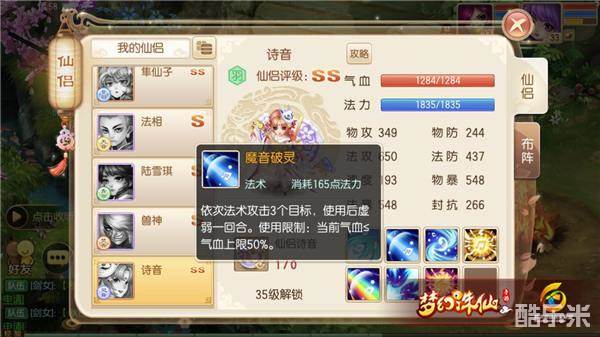 先来说她的基本属性,诗音是必须通过福缘宝箱才有小几率可以得到的稀少SS级仙侣,作为SS级的仙侣,它的基础属性无可厚非是十分厉害的了。不仅它的法攻是所有仙侣中最强的,作为输出型仙侣,它还有比其他输出仙侣更强的气血和法力,物防、法防、法暴、封抗那些也与其他仙侣差不多高,总结一下,它属于一个厉害的法系输出仙侣,战斗力比平常仙侣厉害很多,可以使玩家的人物增强很多综合战斗力。看完属性我们看一看技能,仙侣最看重的还是实战的结果,我们分析一下诗音的仙侣技能有哪些特别的优点: